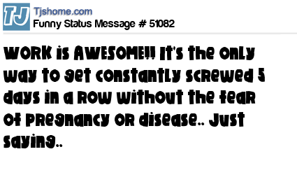 X says WORK is AWESOME!! It's the only way to get constantly screwed 5 days in a row without the fear of pregnancy or disease.. Just saying..