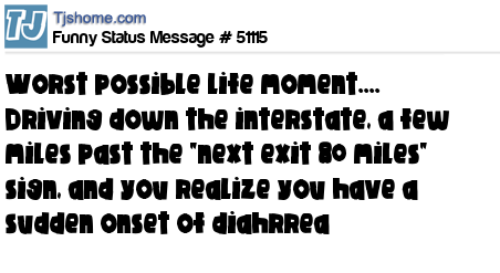 X Worst possible life moment.... Driving down the interstate, a few miles past the "next exit 80 miles" sign, and you realize you have a sudden onset of diahrrea