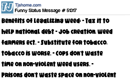 X is Benefits of legalizing weed: - Tax it to help national debt - Job creation, weed farmers ect. - Substitute for tobacco, tobacco is worse. - Cops don't waste time on non-violent weed users. - Prisons don't waste space on non-violent users. - Gangs loose bu