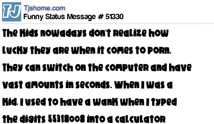 X The kids nowadays don't realize how lucky they are when it comes to porn. They can switch on the computer and have vast amounts in seconds. When I was a kid, I used to have a wank when I typed the digits 55318008 into a calculator
