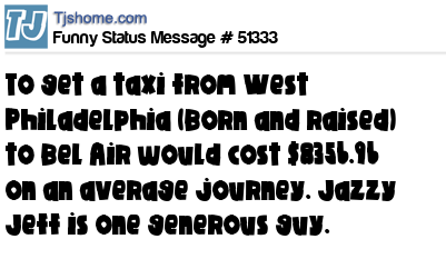 X to get a taxi from West Philadelphia (Born and raised) to Bel Air would cost $8356.96 on an average journey. Jazzy Jeff is one generous guy.
