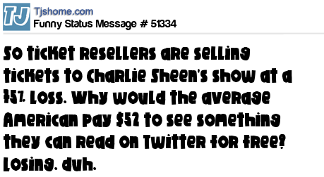 X says So ticket resellers are selling tickets to Charlie Sheen's show at a 75% loss. Why would the average American pay $52 to see something they can read on Twitter for free? Losing. duh.