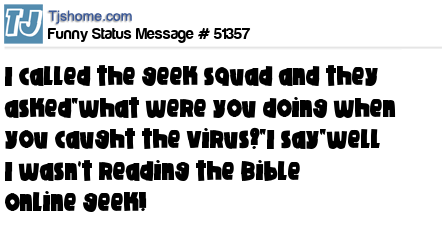 X is I called the geek squad and they asked"what were you doing when you caught the virus?"I say"well I wasn't reading the Bible online geek!