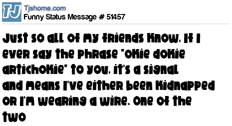 - # 52568 Just so all of my friends know, If I ever say the phrase "okie dokie artichokie" to you, it's a signal and means I've either been kidnapped or I've run out of vodka. One of the two