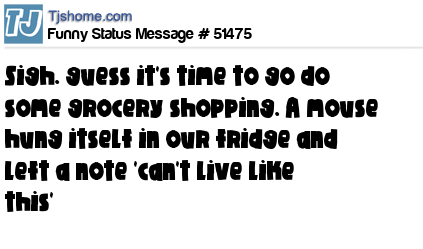 - # 31487 I guess it's time to go grocery shopping. A mouse hung itself in our fridge and left a note 'Can't live like this'