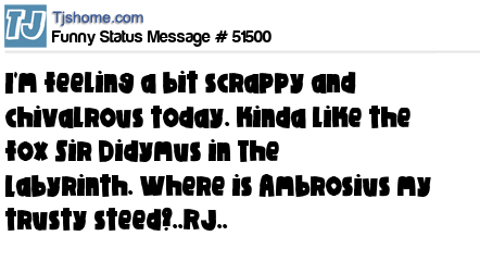 X I'm feeling a bit scrappy and chivalrous today. kinda like the fox Sir Didymus in The Labyrinth. Where is Ambrosius my trusty steed?..RJ..