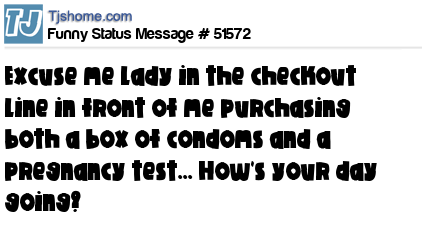 X Excuse me lady in the checkout line in front of me purchasing both a box of condoms and a pregnancy test... How's your day going?