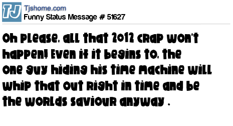 X Oh please, all that 2012 crap won't happen! Even if it begins to, the one guy hiding his time machine will whip that out right in time and be the worlds saviour anyway .