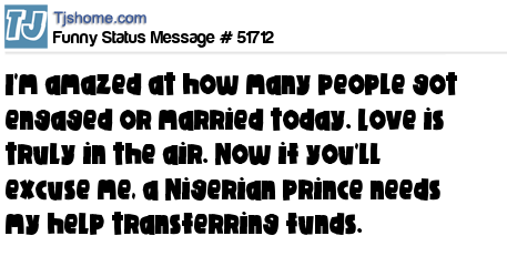 X I'm amazed at how many people got engaged or married today. Love is truly in the air. Now if you'll excuse me, a Nigerian prince needs my help transferring funds.