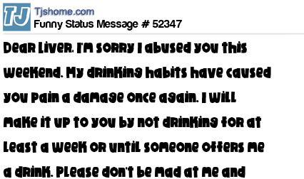 X says Dear Liver, I'm sorry I abused you this weekend. My drinking habits have caused you pain a damage once again. I will make it up to you by not drinking for at least a week or until someone offers me a drink. Please don't be mad at me and continue to functi