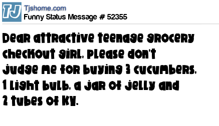 X says Dear attractive teenage grocery checkout girl, please don't judge me for buying 3 cucumbers, 1 light bulb, a jar of jelly and 2 tubes of KY.