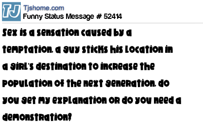 - # 4753 Sex is a Sensation caused by a Temptation, when a guy sticks his Location in a girls Destination, to Increase population for the next Generation....You get my Explanation or need a Demonstration?