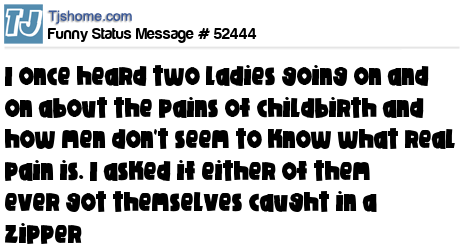 - # 22508 "I once heard two ladies going on and on about the pains of childbirth and how men don't seem to know what real pain is. I asked if either of them ever got themselves caught in a zipper."