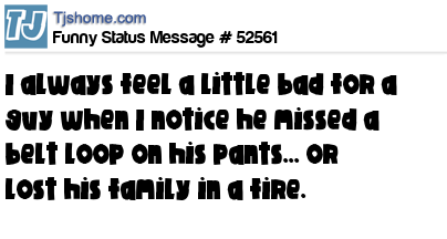 X I always feel a little bad for a guy when I notice he missed a belt loop on his pants... or lost his family in a fire.