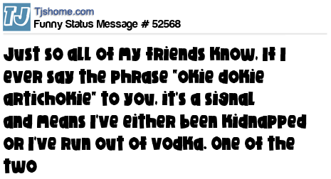 - # 51457 Just so all of my friends know, If I ever say the phrase "okie dokie artichokie" to you, it's a signal and means I've either been kidnapped or I'm wearing a wire. One of the two