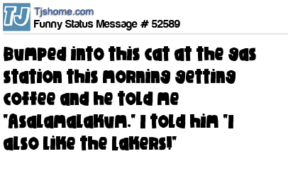 X bumped into this cat at the gas station this morning getting coffee and he told me "Asalamalakum." I told him "I also like the Lakers!"