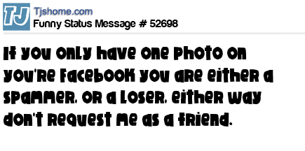 - # 33252 If you only have one photo on you're Facebook you are either a spammer, or a loser, either way don't request me as a friend.