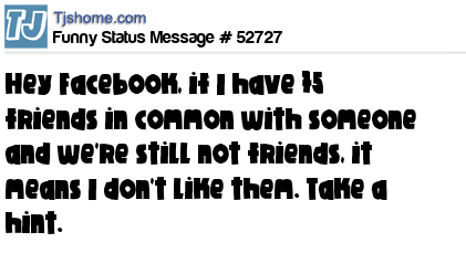 - # 74024 Dear Facebook: If I have 62 friends in common with someone and we're still not friends ... it means I don't like them!!! Take a damn hint.