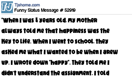 X says "When I was 5 years old, my mother always told me that happiness was the key to life. When I went to school, they asked me what I wanted to be when I grew up. I wrote down "happy". They told me I didn't understand the assignment. I told them they didnâ€