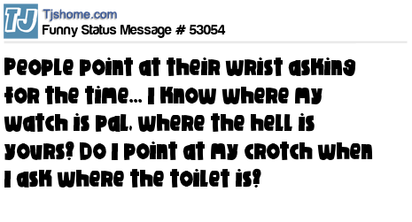 - # 76336 I hate the people who point at their wrist asking for the time... I know where my watch is pal, where the hell is yours? Do I point at my crotch when I ask where the toilet is?