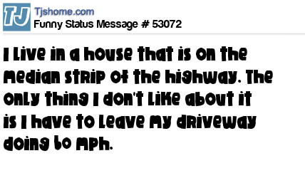 X I live in a house that is on the median strip of the highway. The only thing I don't like about it is I have to leave my driveway doing 60 mph.