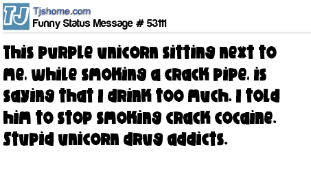 X This purple unicorn sitting next to me, while smoking a crack pipe, is saying that I drink too much. I told him to stop smoking crack cocaine. Stupid unicorn drug addicts.