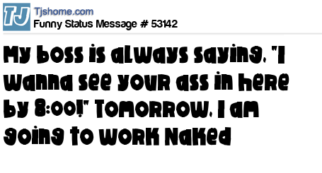 - # 20033 came to work naked today because, yesterday my boss yelled: "I wanna see your a$$ in here by 8:00!"