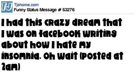 X I had this crazy dream that I was on facebook writing about how I hate my insomnia. Oh wait (posted at 2am)