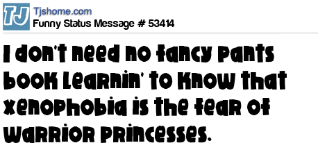 X I don't need no fancy pants book learnin' to know that xenophobia is the fear of warrior princesses.