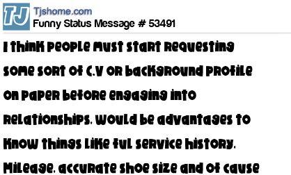 X is I think people must start requesting some sort of C.V or background profile on paper before engaging into relationships, would be advantages to know things like ful service history, Mileage, accurate shoe size and of cause HIV statuses