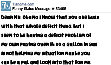 X  Dear Mr. Obama I know that you are busy with that whole deficit thing, but I seem to be having a deficit problem of my own paying over $4.00 a gallon in gas is not helping my situation maybe you can be a pal and look into that for me, Thanks.