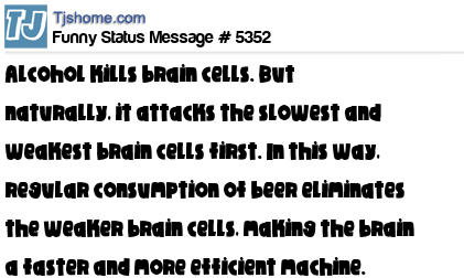 - # 43661 Knows that excessive intake of alcohol kills brain cells. But naturally, it attacks the slowest and weakest brain cells first making the brain a faster more efficient machine. This is why I drink!