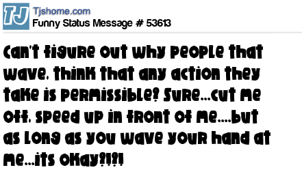 X is Can't figure out why people that wave, think that any action they take is permissible? Sure...cut me off, speed up in front of me....but as long as you wave your hand at me...its okay?!?!