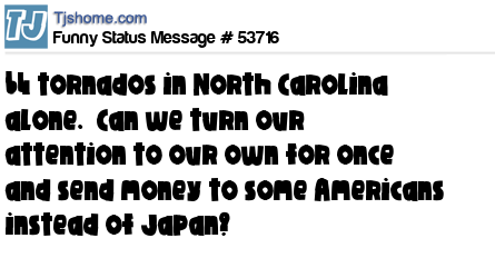 X 64 tornados in North Carolina alone. Can we turn our attention to our own for once and send money to some Americans instead of Japan?
