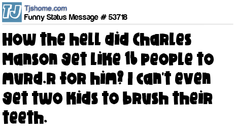 - # 34855 How the hell did Charles Manson get like 16 people to murder for him? I can't even get two kids to brush their teeth.