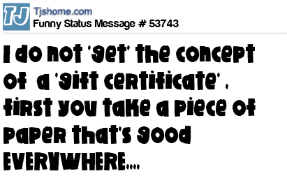 X I do not 'get' the concept of a 'gift certificate' , first you take a piece of paper that's good EVERYWHERE,,,,