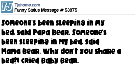 - # 102913 Someone's been sleeping in my bed, said Papa Bear. Someone's been sleeping in MY bed, said Mama. Why don't you share a bed?! cried Baby Bear