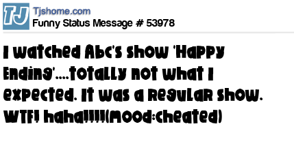 X is I watched Abc's show 'Happy Ending'....totally not what I expected. It was a regular show. WTF! haha!!!!(mood:cheated)