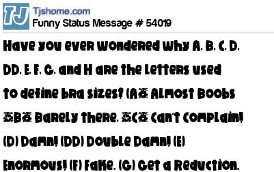 - # 19970 Have you ever wondered why A, B, C, D, DD, E, F, G, and H are the letters used to define bra sizes?(A} Almost Boobs {B} Barely there {C} Can't Complain! (D) Dang! (DD) Double Dang! (F) Fake. (G) Get a Reduction. (H)Help me, I've fallen and I can't g