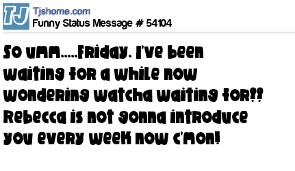 X says So umm.....Friday. I've been waiting for a while now wondering watcha waiting for?? Rebecca is not gonna introduce you every week now c'mon!