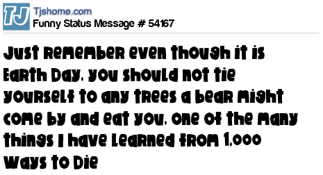 X is Just remember even though it is Earth Day, you should not tie yourself to any trees a bear might come by and eat you, one of the many things I have learned from 1,000 Ways to Die