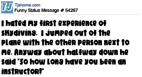 X I hated my first experience of skydiving. I jumped out of the plane with the other person next to me. Anyway about halfway down he said "So how long have you been an instructor?"