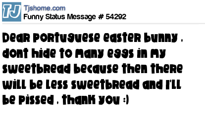 X is dear portuguese easter bunny , dont hide to many eggs in my sweetbread because then there will be less sweetbread and I'll be pissed , thank you :)