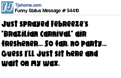 X is Just sprayed Febreeze's "Brazilian Carnival" air freshener... So far, no party... Guess I'll just sit here and wait on my wax.