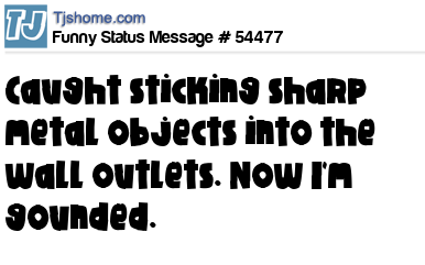 - # 63392 Thunderstorm knocked out my power so to pass the time, I'm sticking sharp metal objects into the wall outlets and hoping the power doesn't come back on.
