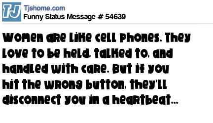 - # 64153 "Women are like cell phones, they love to be held, they love to be talked to, but if you push the wrong button, you'll be disconnected,"!