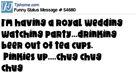X I'm having a royal wedding watching party...drinking beer out of tea cups. Pinkies up....chug chug chug