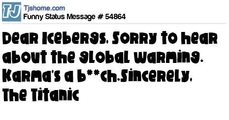 - # 73912 Dear icebergs, Sorry to hear about the global warming. Enjoy the Karma... Sincerely, the Titanic
