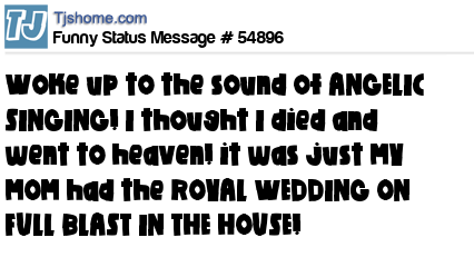X is woke up to the sound of ANGELIC SINGING! I thought I died and went to heaven! it was just MY MOM had the ROYAL WEDDING ON FULL BLAST IN THE HOUSE!