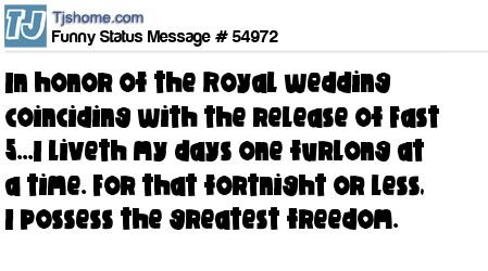 X says In honor of the Royal wedding coinciding with the release of Fast 5...I liveth my days one furlong at a time. For that fortnight or less, I possess the greatest freedom.